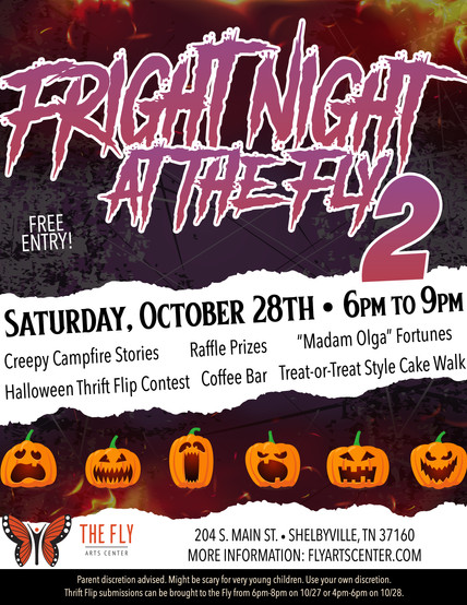 Join us for Fright Night at The Fly 2 for creepy campfire stories, raffle prizes, a coffee bar, a Halloween Thrift Flip Contest, fortunes by "Madam Olga", a Treat-or-Treat Style Cake Walk, and more. This is a free event. Parent discretion is advised. Some elements may be too scary for young children. "Halloween Thrift Flip Contest"